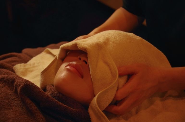 頭皮や顔のツボを優しく刺激し、緊張を緩和するテクニックを習得。